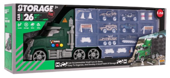 Interaktywny zestaw militarny, ciężarówka wojskowa z efektami dźwięku i światła oraz akcesoriami dla dzieci od 3- go roku życia. Ciężarówka kryje w sobie wiele tajemnic do odkrycia. Po bokach naczepy znajdują się otwierane schowki na akcesoria dołączone do zestawu. Na dachu kabiny jest zjeżdżalnia dla autek wojskowych znajdujących się w zestawie. Autko wkładamy w dach kabiny a wyjeżdża ono przodem pojazdu. Kabina ciężarówki posiada oświetlenie, a po bokach przyciski dźwiękowe, po wciśnięciu których usłyszymy odgłosy odpalania pojazdu, klaksony i wesołą melodię. Do zestawu dołączona akcesoria takie jak 6 autek wojskowych typu resoraki, 2 beczułki, 4 stożki, 4 płotki, 2 bariery stop. Zabawka zasilana jest bateriami typu 3 x LR44 1,5 V (w zestawie).
