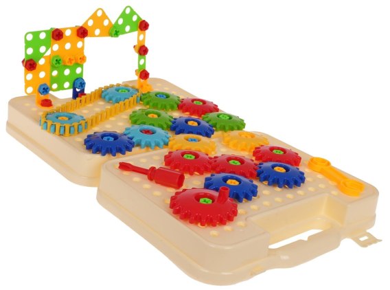 Zestaw inżynierski dla małego konstruktora od 3-go roku życia. Zestaw składa się z rozkładanej walizki, kół zębatych, klocków i narzędzi. Waliska po rozłożeniu służy jako podstawka do przykręcania zębatych kółek. Zadaniem dziecka jest ułożenie przekładni w taki sposób, aby stworzyć system kół zębatych napędzanych jednym elementem. Dziecko pozna zasady mechaniki i rozwinie myślenie przyczynowo-skutkowe. Zębatki przykręca się do podstawki narzędziami dołączonymi do zestawu: śrubokrętem i kluczem.