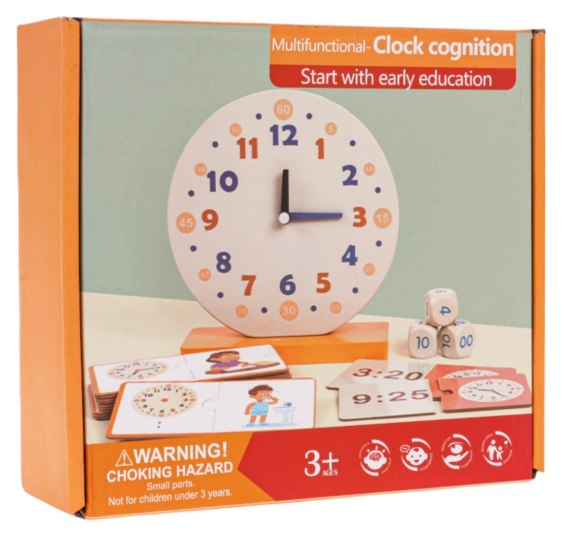 Edukacyjny zestaw z zegarem i akcesoriami dla dzieci powyżej 3-go roku życia. W zestawie znajduje się duży drewniany zegar z ruchomymi wskazówkami, 3 kostki, 24 elementy do układania oraz mazak. Z tym zestawem dziecko nauczy się posługiwać zegarkiem, będzie trenować pamięć, koncentrację i spostrzegawczość. Na dużym drewnianym zegarze, można przesuwać wskazówki zegara, odczytując czas, możemy również polecić dziecku ułożenie ze wskazówek konkretnej godziny. Na kostkach zamiast cyfr arabskich znajdują się godziny, na jednej kostce od 1 do 6, na drugiej od 7 do 12, na trzeciej zaś minuty od 00 do 50 minut. Dziecko może rzucać kostkami, a następnie układać konkretny czas na zegarze. W zestawie znajdują się również dwustronne elementy do układania. Z jednej strony mamy zegar, a z drugiej strony dziecko musi dopiąć element z właściwą godziną. Z drugiej strony układanki mamy obrazki z konkretnymi czynnościami, a dziecko za zadanie będzie miało namalować na zegarze godzinę wykonywania konkretnej czynności.