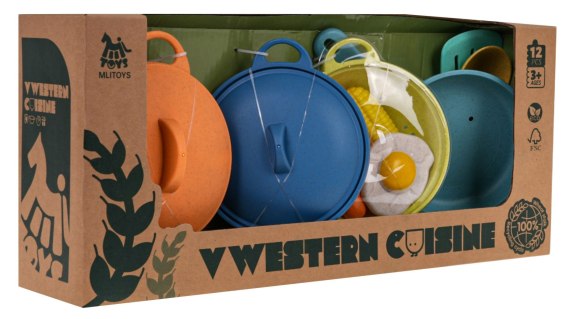 Zestaw garnków wykonanych z Bioplastiku, dla dziecka od 3-go roku życia. Zestaw składa się z 12 elementów w różnych kolorach. Mamy patelnię, dwa garnki z pokrywką, cedzak, łopatkę, łyżkę oraz atrapy produktów spożywczych takie jak jajko sadzone, nóżka z kurczaka, marchewka, kukurydza. Ten zestaw daje nieograniczone możliwości zabawy. Materiał, z którego wykonany jest zestaw, jest przyjazny dla dziecka i środowiska naturalnego.