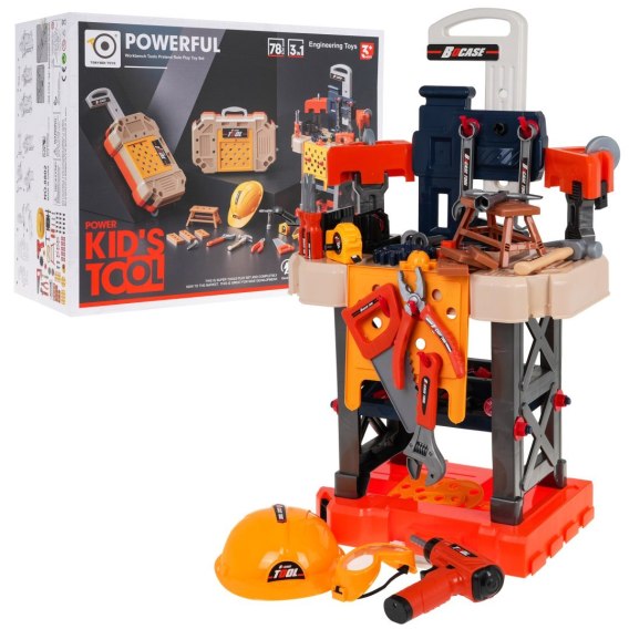 Bogato wyposażony zestaw narzędzi 3 w 1 dla małych majsterkowiczów od 3-go roku życia. Z zestawu możemy zbudować stolik warsztatowy a po skończonej zabawie przekształcić go w walizkę na narzędzia dołączone do zestawu. Możemy zbudować walizkę z rączką do przenoszenia lub walizkę na kółkach do pchania. Zestaw zawiera 78 elementów takich jak części składowe warsztatu, kask, piła, śrubokręty, wiertarko-wkrętarkę na baterie, dużą ilość śrubek itp. Wkrętarka zasilana jest bateriami typu 2 x 1,5V AA, brak baterii w zestawie. Wkrętarko-wiertarka działa jak prawdziwa, wkręca, wykręca, a podczas pracy świeci się czerwona dioda na przodzie zabawki.