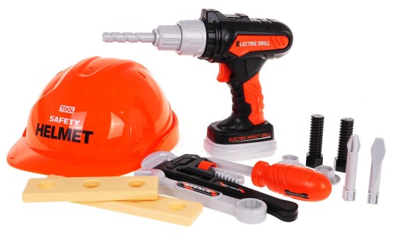 Bogato wyposażony zestaw narzędzi z kaskiem i interaktywną wiertarko-wkrętarką dla dzieci powyżej 3-go roku życia. Zestaw wykonany został z plastiku najlepszej jakości i składa się z 15 elementów. W zestawie prócz kasku znajdują się: wiertarka, śrubokręt, klucz francuski, klucz, dwie śrubki, dwie nakładki na śrubki, deseczka mała i duża. Wiertarko-wkrętarka zasilana jest bateriami typu 2 x AA, brak w zestawie, posiada wyjmowany akumulator tak jak w prawdziwej wiertarce dla dorosłych oraz wymienne bity: krzyżakowy, płaski i wiertło. Możemy nią wkręcać i wykręcać śrubki. Zestaw rozwija zdolności manualne u dzieci, wyobraźnię i pasję do majsterkowania.