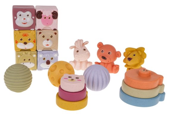 Zestaw 18 kolorowych zabawek sensorycznych, dla maluszka od 6-go miesiąca życia. Różnorodna kolorystyka pobudza zmysły dziecka, a różnorodne kształty zachęcają do kreatywnej zabawy. Dzięki zróżnicowanej fakturze każdy element zestawu dostarcza dziecku innych wrażeń czuciowych. Zestaw może być używane w celach terapeutycznych, edukacyjnych lub jako zabawki sensoryczne dla dzieci.