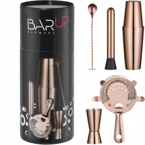 Zestaw barmański w tubie firmy BarUp, to starannie przemyślany i skomponowany zestaw podstawowych, profesjonalnych i niezbędnych narzędzi barmana. Zamknięty jest w estetycznym, tekturowym pudełku w formie tuby, dzięki czemu to również wspaniały pomysł na prezent dla pasjonatów sztuki barmańskiej. Zestaw 5 elementów został wykonany ze stali nierdzewnej AISI 201 z powłoką w kolorze miedzianym z błyszczącym wykończeniem. Shaker bostoński Tin-on-Tin posiada 2 kubki z obciążeniem, o pojemnościach 500 ml i 800 ml. Klasyczny jigger o pojemnościach 50 ml i 25 ml. Sitko barmańskie Hawthorne z profilowanym uchwytem oraz demontowaną sprężyną (ułatwia czyszczenie, można jej też używać jako „spring whisk#8221;) idealnie pasuje do shakera, doskonale odcedza drobne kawałki lodu, owoców i ziół.  Muddler (moździerz barmański) z ząbkowaną powierzchnią, do szybkiego rozgniatania kawałków owoców i ziół. Końcówka muddlera wykonana jest z polipropylenu (PP). Spiralna łyżka barmańska o długości 27 cm i pojemności 5 ml z muddlerem (końcówka w kształcie dysku) do szybkiego mieszania drinków z lodem bez rozwadniania ich, do wlewania napojów gazowanych bez spieniania oraz tworzenia warstwowych koktajli. Zestaw umieszczony jest w kartonowej tubie z elegancką grafiką. Elementy zestawu nie nadają się do mycia w zmywarce.