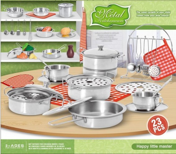 Znakomicie wykonany, wytrzymały, metalowy zestaw garnków z akcesoriami dla dzieci od 3-go roku życia. Zestaw składa się z wielu elementów niezbędnych w każdej dziecięcej kuchni. Są tu garnki z pokrywkami, przybory kuchenne, fartuszek kucharza, rękawica, talerze, łyżeczki itd. Wykonanie z metalu gwarantuje wytrzymałość i solidność.