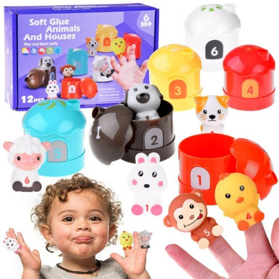 Świetny zestaw zwierzątek w domkach do zabawy w teatrzyk, naukę liczenia, zabawy w kąpieli. Zwierzątka mieszkają każdy w swoim domku, domki są okrągłe z otwieranym dachem, a na każdym domku jest cyferka. W domku mieszka gumowe zwierzątko, każde zwierzątko ma cyferkę na brzuszku i otwór od spodu, dzięki czemu można bawić się nim w teatrzyk.