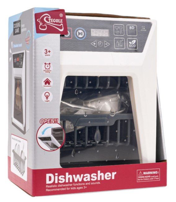 Interaktywna zmywarka do naczyń z funkcją dźwięku i światła dla dzieci od 3-go roku życia. Zmywarka wygląda jak prawdziwa i wydaje charakterystyczne odgłosy pracy. Wykonana została z najlepszej jakości materiałów, jest bezpieczna dla dziecka. Aby uruchomić zmywarkę, należy przycisnąć czerwony przycisk znajdujący się na panelu dotykowym i wybrać program, następnie przycisnąć przycisk play. Zmywarka zacznie wydawać odgłosy charakterystyczne dla wybranego programu i odliczać czas pozostały do zakończenia programu. Drzwi zmywarki są otwierane, a ze środka możemy wyjąć szufladę na naczynia. Do zestawu dołączono liczne naczynia i sztućce. Zabawka zasilana jest bateriami typu 2 x AA 1,5 V (brak w zestawie).